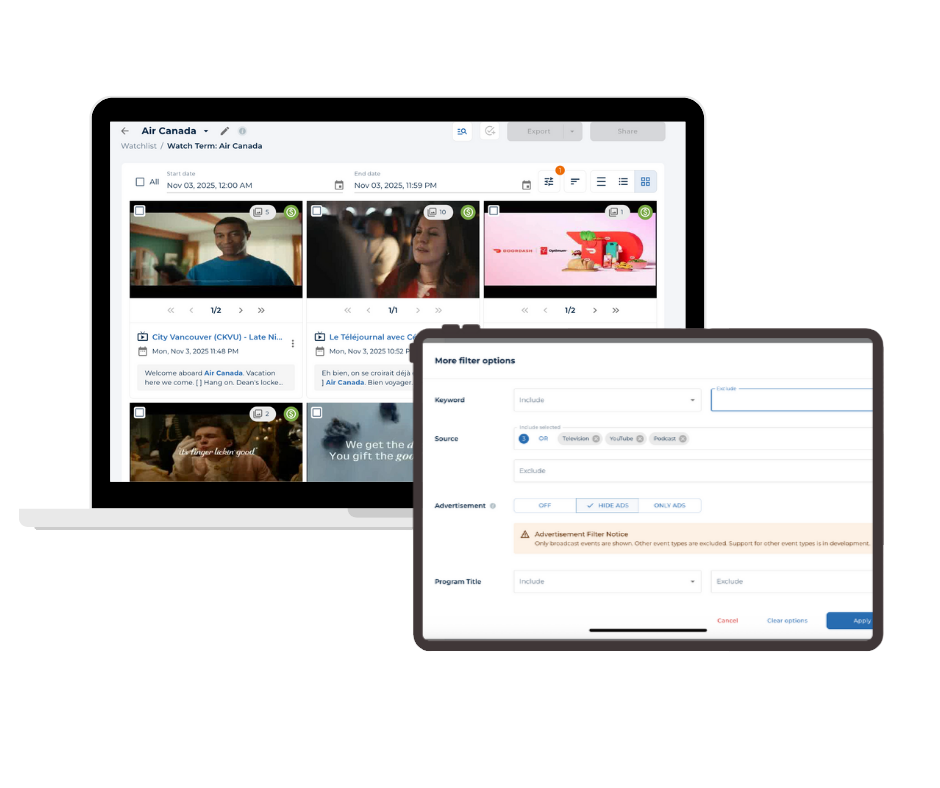 With licensed access to leading broadcasters, 2,000+ Canadian podcast sources, and full English/French monitoring, TVEyes Canada is uniquely positioned to offer the most comprehensive media intelligence in the country.